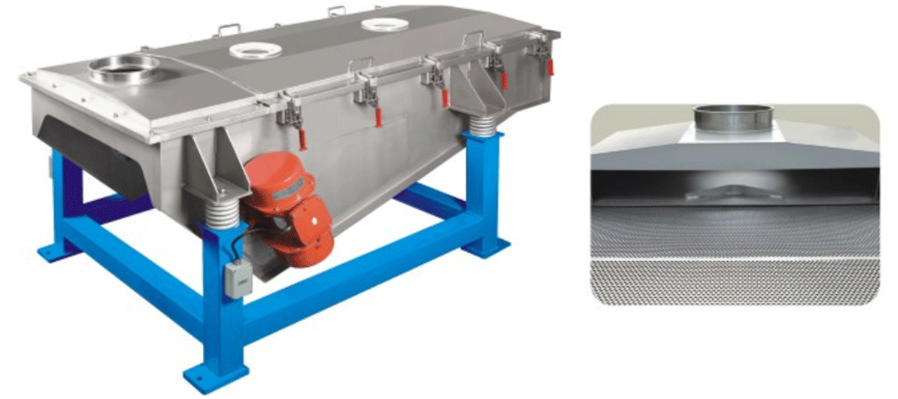 振動篩由振動馬達(dá)、篩網(wǎng)、本體支座及減震塊組成。在振動馬達(dá)的作用下,物料沿直線向前運動,在其輸送過程中,通過不同的網(wǎng)孔篩選,將超長、并列以及粉末篩分出來。整體采用全封閉設(shè)計,外設(shè)取樣觀察口,采用C型夾固定,可以快速拆卸清理或更換篩網(wǎng)。